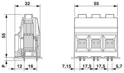 Клеммы для печатной платы, номинальный ток: 192 A, номинальное напряжение: 1000 В, размер шага: 17,5 мм, полюсов: 2, тип подключения: Винтовой зажим с натяжной гильзой, монтаж: Пайка волной припоя, направление подключения, проводник/печатная плата: 0 °, цвет: зеленый