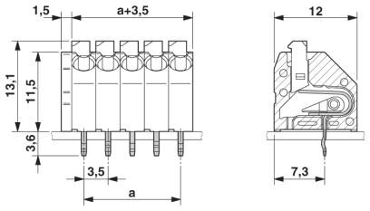 Клеммы для печатной платы, номинальный ток: 8 A, номинальное напряжение: 250 В, размер шага: 3,5 мм, полюсов: 10, тип подключения: Пружинные зажимы Push-in, монтаж: Пайка волной припоя, направление подключения, проводник/печатная плата: 45 °, цвет: зеленый. Выводы под пайку в передней области, однорядн.
