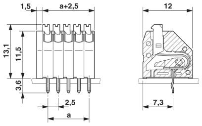 Клеммы для печатной платы, номинальный ток: 2 A, номинальное напряжение: 250 В, размер шага: 2,5 мм, полюсов: 8, тип подключения: Пружинные зажимы Push-in, монтаж: Пайка волной припоя, направление подключения, проводник/печатная плата: 45 °, цвет: зеленый. Выводы под пайку в передней области, однорядн.