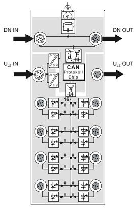 Автономное устройство для DeviceNet™ имеет 16 цифровых входов. Подсоединение M12 производится с использованием системы быстрого подключения. Цепь питания 24 М DC защищена от короткого замыкания и перегрузки. Номинальный ток устройства составляет 1,2 А.