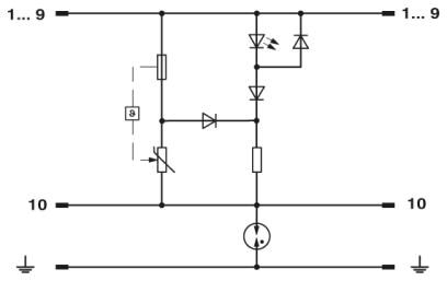 Штекер LSA-PLUS (COMTRAB CT 10) с защитой от импульсных перенапряжений, вкл. визуальную сигнализацию неисправности для девяти 2-проводных сигнальных цепей. Номинальное напряжение: 230 В AC. Исполнение: 10 парных жил