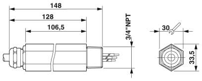 Устройство защиты от импульсных перенапряжений в форме модуля с резьбовым соединением, с корпусом IP67, для измерительных датчиков искробезопасных цепей, наружная резьба 3/4'' NPT для непосредственного монтажа, резьбовой сальник для сигнальных проводов, двухкаскадная схема защиты. Совместимость с HART.
