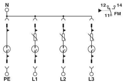 Вставной УЗИП, без токов утечки, тип 2 / класс II, для 3-фазных цепей питания с отдельными проводниками N и PE (5-проводная система: L1, L2, L3, N, PE), с контактом дистанционной сигнализации.
