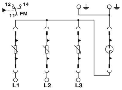 Комбинированный разрядник для защиты от перенапряжений, 3-канальный, для монтажа на NS 35/7,5, с переключающим контактом для передачи дистанционного сигнала (FM), напряжение 400 B AC