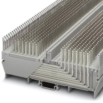 - Между группой штыревых выводов и держателем маркировочных элементов предусмотрены два паза для установки магистральных шин