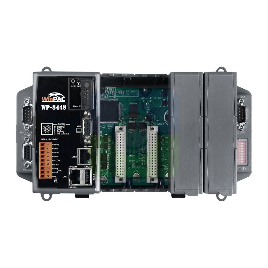 Контроллер на базе процессора PXA270 520 МГц, 128 Mб SDRAM, 96 Mб Flash, 2 x RS-232, 1 x RS-485, 1 x RS-232/485, 2 x Ethernet (RJ-45), 1 x USB 1.1, microSD, 4 слота расширения, Windows CE 5.0, ПО Win-GRAF